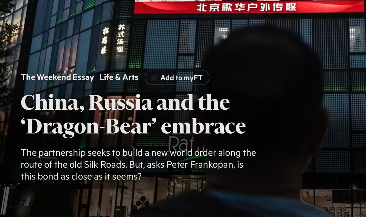 Say what you like about Peter Frankopan — he can spin a grand yarn. In the Financial Times this weekend, he dusted off the old silk banners of Eurasia, wrapped them around some talk of empire, and gave us a sprawling picture of Russia and China — two predators, he says, forging a new world order to keep the West awake at night.